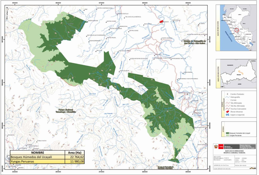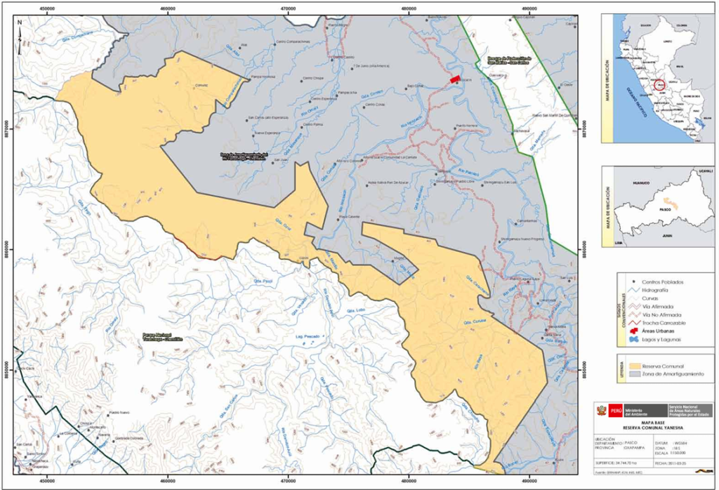 Está ubicada en la selva central del Perú en la región Pasco, provincia Oxapampa y en el distrito de Palcazú, fue establecida con un área legal de 34 744 ,70 hectáreas, limita por el Norte con la comunidad nativa Alto Lagarto y el Parque Nacional Yanachaga Chemillen, por el Este con Siete de Junio, Nueva Esperanza, Alto Iscozacín, Shiringamazu y Loma Linda Laguna, por el Sur con San Pedro de Pichanaz y Santa Rosa de Pichanaz y por el Oeste con el Parque Nacional Yanachaga Chemillen.